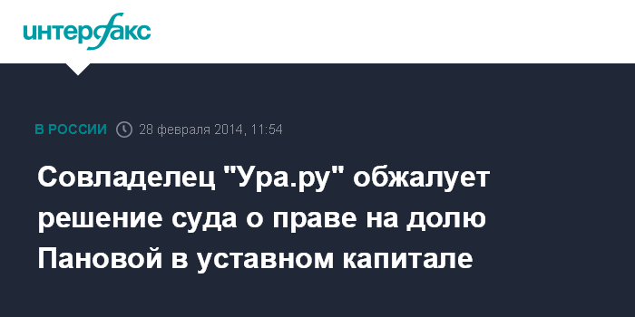 В 2013 году компания "BF TEN" Holding GmbH, владеющая 51% доли в уставном капитале "Ура.ру", обратилась в Арбитражный суд Свердловской области с иском к бывшему шеф-редактору информагентства Пановой, владеющей 49% долей, о признании договора купли-продажи 49% доли в уставном капитале "Ура.ру" заключенным, а также о признании права компании на эту долю.