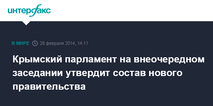 Симферополь. 28 февраля. INTERFAX.RU - Верховный совет Крыма в 15.00 (17:00 МСК) соберется на внеочередное заседание, на котором будет утвержден состав нового правительства автономии, сообщила агентству "Интерфакс" начальник информационно-аналитического управления секретариата верховного совета Крыма Ольга Сульникова.