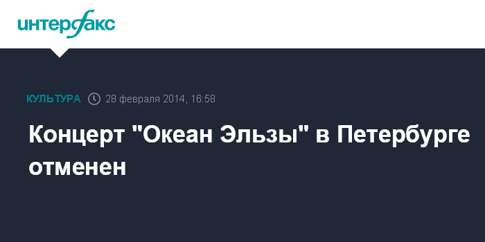 Москва. 28 февраля. INTERFAX.RU - Организаторы концерта "Океан Эльзы" в Петербурге приняли решение отказаться от проведения мероприятия, сообщили "Интерфаксу" в компании "Евро шоу" в пятницу.