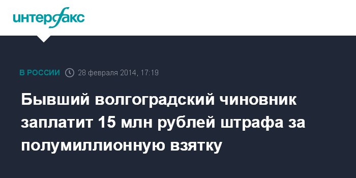 Бывший волгоградский чиновник заплатит 15 млн рублей штрафа за полумиллионную взятку