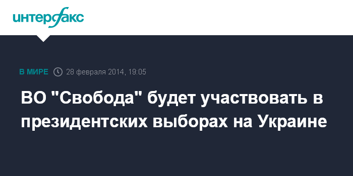 Москва. 28 февраля. INTERFAX.RU - Лидер ВО "Свобода" Олег Тягнибок заявляет, что его политическая сила будет участвовать в выборах президента Украины, но формат участия будет определен на съезде в ближайшее время.