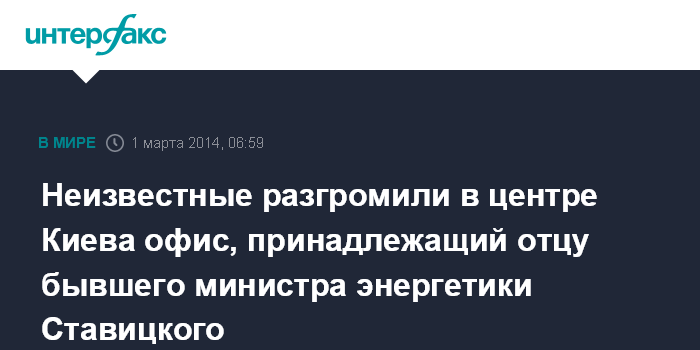 Киев. 1 марта. ИНТЕРФАКС-УКРАИНА - Около 30 человек, которые представились членами "самообороны Майдана", напали в центре Киева на офис отца бывшего министра энергетики и угольной промышленности Украины Эдуарда Ставицкого, который он якобы сдает в аренду юридической фирме.