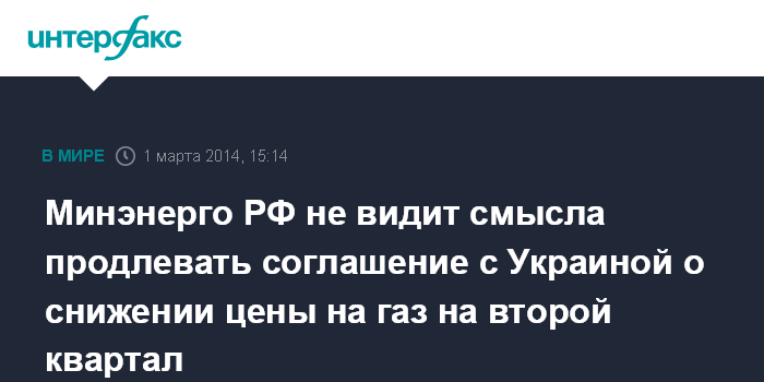 Москва. 1 марта. INTERFAX.RU - В связи с нарушением украинской стороной обязательств по выплате за газ продлевать соглашение о снижении цены на второй квартал не имеет смысла, считают в Минэнерго РФ. "Украина не расплатилась за газ по текущим платежам по сниженной цене и до сих пор не погасила долг 2013 года", - сказал "Интерфаксу" представитель Минэнерго. "Если так будет происходить и дальше, то какой смысл и дальше продлевать действие соглашения о поставках газа по сниженным ценам? Никакого", - сказал собеседник агентства.
