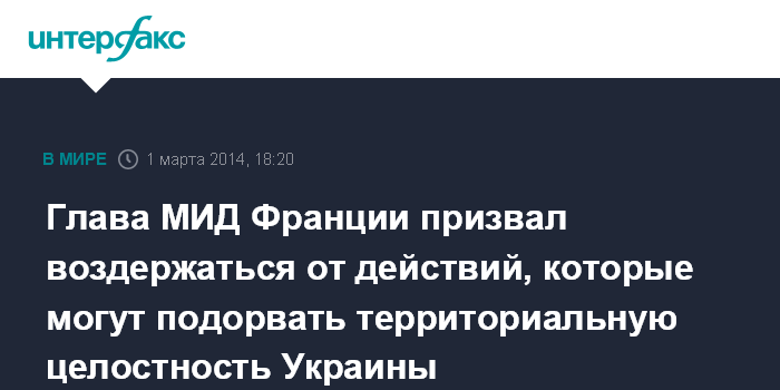 Москва. 1 марта. INTERFAX.RU - Министр иностранных дел Франции Лоран Фабиус призывает стороны воздержаться от действий, которые могут подорвать территориальную целостность Украины. "Мы призываем стороны воздержаться от действий, способных поддерживать напряженность и подорвать территориальную целостность", - прокомментировал ситуацию в Крыму Л.Фабиус на своей странице в Twitter.