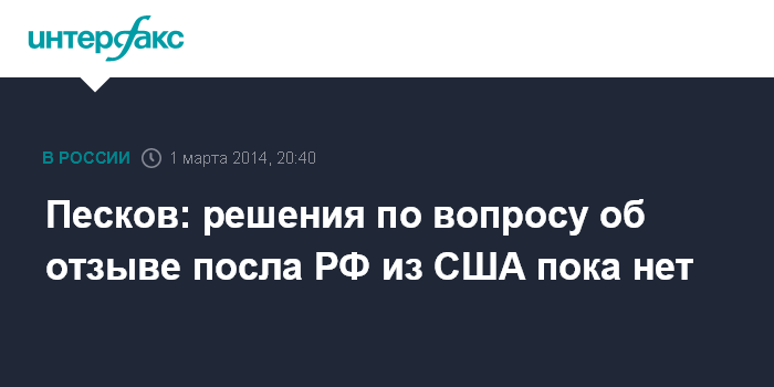 Москва. 1 марта. INTERFAX.RU - Прозвучавшее в Совете Федерации предложение отозвать посла РФ в Вашингтоне - это мнение, высказанное сенаторами, никаких решений на этот счет в Кремле пока не принималось, заявил пресс-секретарь главы государства Дмитрий Песков.