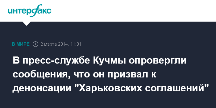 Москва. 2 марта. INTERFAX.RU - В пресс-службе второго президента Украины (1994-2005 годы -ИФ) Леонида Кучмы опровергают информацию, что он призывает к денонсации "Харьковских соглашений" о базировании Черноморского флота Российской Федерации в Крыму.
