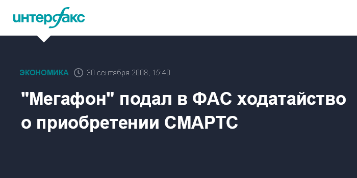 Москва. 30 сентября. INTERFAX.RU - ОАО "Мегафон" 5 сентября подало в Федеральную антимонопольную службу (ФАС) ходатайство о приобретении 100% акций ОАО "Средневолжская межрегиональная ассоциация радиотелекоммуникационных систем" (СМАРТС).