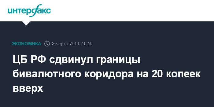 Москва. 3 марта. INTERFAX.RU - ЦБ РФ сдвинул границы бивалютного коридора вверх сразу на 20 копеек. На 28 февраля границы коридора составили 35,4-42,4 рубля, говорится в материалах ЦБ, размещенных на его сайте.