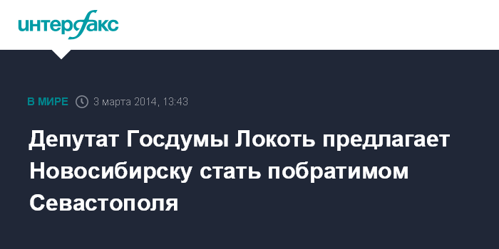 Москва. 3 марта. INTERFAX.RU - Депутат Госдумы России, первый секретарь новосибирского обкома КПРФ Анатолий Локоть считает, что Новосибирску следует заключить соглашение о побратимстве с Севастополем.