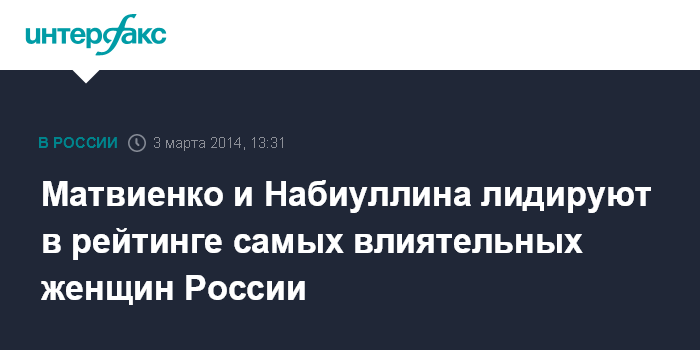Москва. 3 марта. INTERFAX.RU - Глава Совета Федерации Валентина Матвиенко заняла, как и в прошлом году, первое место в рейтинге "100 самых влиятельных женщин России", подготовленном радиостанцией "Эхо Москвы" при поддержке журнала "Огонек" и агентства "Интерфакс".