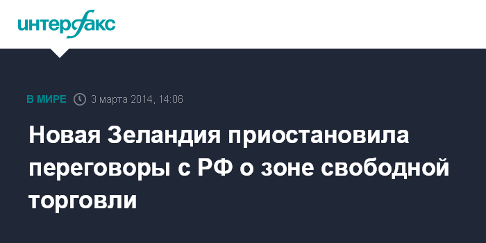 Москва. 3 марта. INTERFAX.RU - Москва. 3 марта. ИНТЕРФАКС - Новая Зеландия приостановила переговоры с РФ о подписании соглашения о зоне свободной торговли с Таможенным союзом из-за ситуации вокруг Украины, сообщает новозеландский телеканал TVNZ.