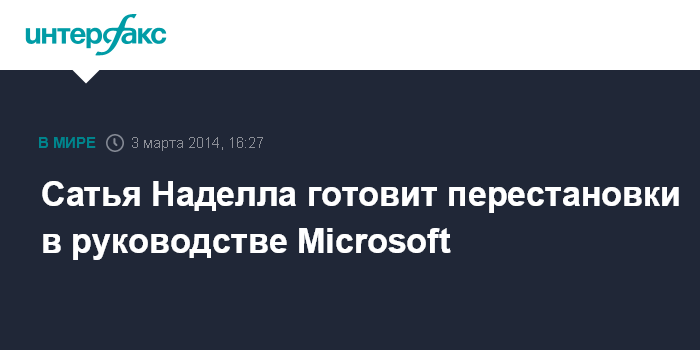 Москва. 3 марта. INTERFAX.RU - Новый глава Microsoft Corp. Сатья Наделла готовится провести масштабные перестановки в руководстве компании, надеясь таким образом способствовать росту бизнеса фирмы, сообщило агентство Bloomberg со ссылкой на информированные источники.