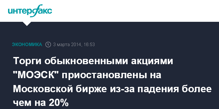 Торги обыкновенными акциями "МОЭСК" приостановлены на Московской бирже из-за падения более чем на 20%