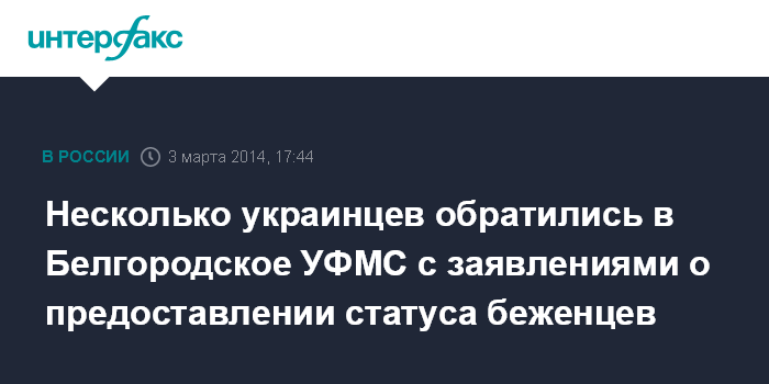 Москва. 3 марта. INTERFAX.RU - Пятеро граждан Украины обратились в понедельник в отделения Управления ФМС России по Белгородской области с заявлениями о предоставлении им статуса беженца, сообщила "Интерфаксу" главный специалист-эксперт управления Людмила Скрипник.