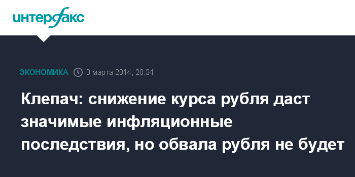 Москва. 3 марта. INTERFAX.RU - Снижения курса рубля приведет к значимым инфляционным последствиям, но обвала рубля ожидать не стоит, заявил "Интерфаксу" заместитель министра экономического развития РФ Андрей Клепач.