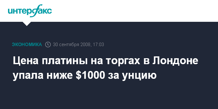 Лондон. 30 сентября. INTERFAX.RU - Цена на платину на торгах в Лондоне упала ниже уровня $1000 за тройскую унцию впервые с февраля 2006 г., сообщает агентство Bloomberg.