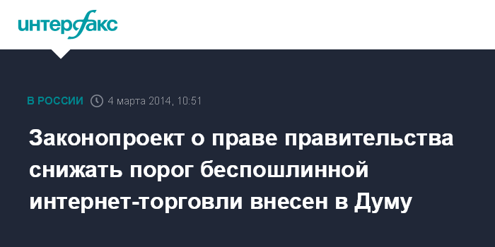 Москва. 4 марта. INTERFAX.RU - Правительство России внесло в Госдуму законопроект, позволяющий правительству снижать порог беспошлинной интернет-торговли.