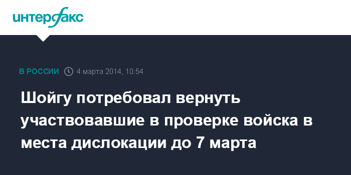 Москва. 4 марта. INTERFAX.RU - Министр обороны России генерал армии Сергей Шойгу на селекторном совещании во вторник потребовал вернуть силы, участвовавшие в завершившейся накануне внезапной проверке войск Западного и Центрального военных округов, в пункты постоянной дислокации до 7 марта.