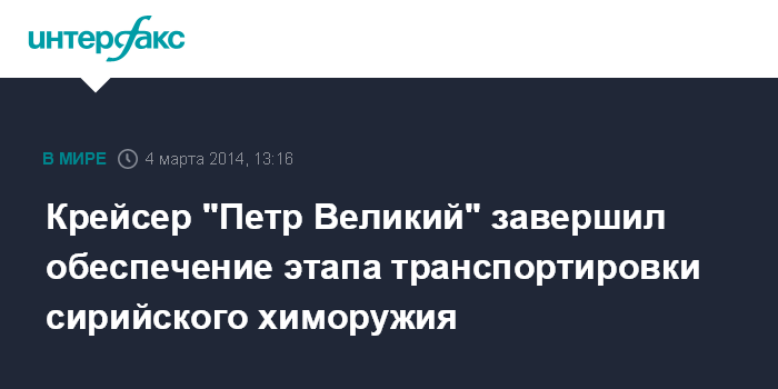 Москва. 4 марта. INTERFAX.RU - Тяжелый атомный ракетный крейсер (ТАРК) Северного флота "Петр Великий", выполняющий задачи в Средиземном море, завершил обеспечение безопасности очередного этапа транспортировки сирийского химического оружия, сообщил во вторник "Интерфаксу" официальный представитель Северного флота капитан 1-го ранга Вадим Серга.