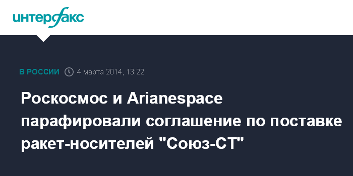 "20-21 февраля в АО "Арианэспас" состоялось совещание, в результате которого было подготовлено и парафировано соглашение между российской и французской стороной на поставку семи дополнительных ракет-носителей "Союз-СТ" для пусков с космодрома Куру. Подписание дополнительного соглашения запланировано на конец апреля 2014 года", - сказал он.