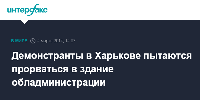 Москва. 4 марта. INTERFAX.RU - Несколько сотен человек с флагами России, Украины и Харьковской области во вторник утром предприняли попытку ворваться в здание областной государственной администрации, где запланировано представление назначенного новыми властями в Киеве губернатора Игоря Балуты.
