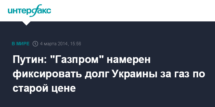 Москва. 4 марта. INTERFAX.RU - Президент России Владимир Путин заявил сегодня журналистам, что "Газпром" говорит не об окончании предоставлении Украине скидки с апреля, а о фиксации задолженности страны за поставки газа по старой цене.