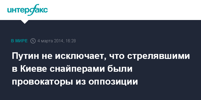 Ново-Огарево. 4 марта. INTERFAX.RU - Президент РФ Владимир Путин заявил, что не исключает, что снайперами, стрелявшими по митингующим на Майдане, были провокаторы из оппозиции.