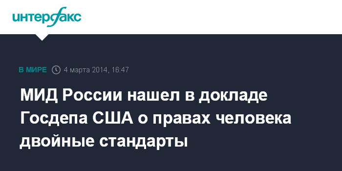 "Обнародованный недавно ежегодный доклад Государственного департамента США о ситуации с соблюдением прав человека в мире в 2013 году страдает теми же изъянами, которые были характерны для предыдущих подобных докладов. Он изобилует избирательными и шаблонными оценками с применением двойных стандартов, например, при упоминании трагических событий на Украине", - говорится в комментарии Долгова, текст которого публикует официальный сайт МИД РФ.