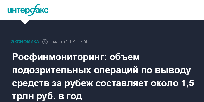 Москва. 4 марта. INTERFAX.RU - Объем операций по выводу средств из России за рубеж, о которых банки сообщают как о подозрительных, составляет около 1,5 трлн рублей, сообщил глава Росфинмониторинга Юрий Чиханчин.