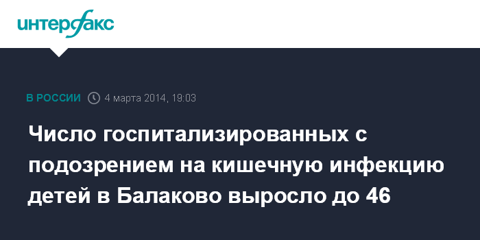 Москва. 4 марта. INTERFAX.RU - По уточненным данным, в детскую больницу города Балаково Саратовской области госпитализированы 46 детей в возрасте от трех месяцев до трех лет с нарушением функции желудочно-кишечного тракта.