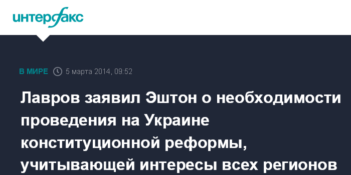 Лавров заявил Эштон о необходимости проведения на Украине конституционной реформы, учитывающей интересы всех регионов страны