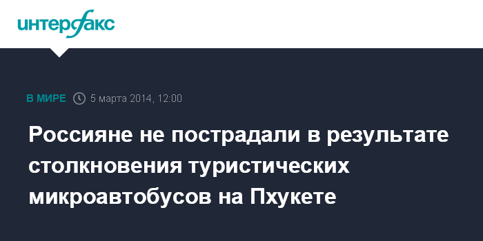 Москва. 5 марта. INTERFAX.RU - Российские туристы не пострадали в результате столкновения двух минивэнов на Пхукете, сообщает The Phuket News.