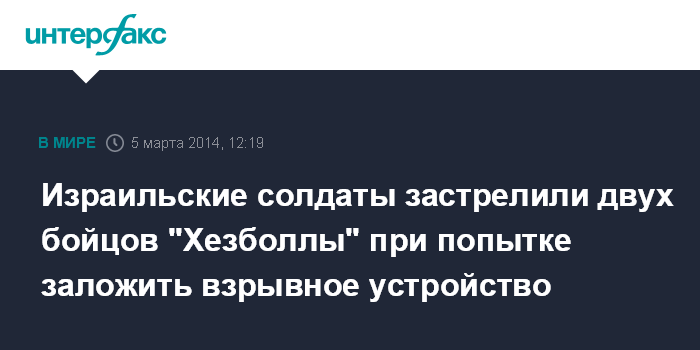 Москва. 5 марта. INTERFAX.RU - Военнослужащие израильской армии ликвидировали в среду двух бойцов ливанского шиитского движения "Хезболла", пытавшихся установить бомбу на границе с Сирией, говорится в заявлении армии обороны Израиля.