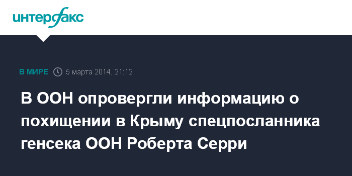 Москва. 5 марта. INTERFAX.RU - Заместитель генсека ООН Ян Элиассон заверил, что спецпосланник генсека Организации Роберт Серри не был похищен в Крыму, сообщает в среду телерадиокорпорация BBC.