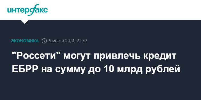 Москва. 5 марта. INTERFAX.RU - ОАО "Россети" может привлечь у Европейского банка реконструкции и развития (ЕБРР) кредит на сумму до 10 млрд руб., следует из материалов банка.
