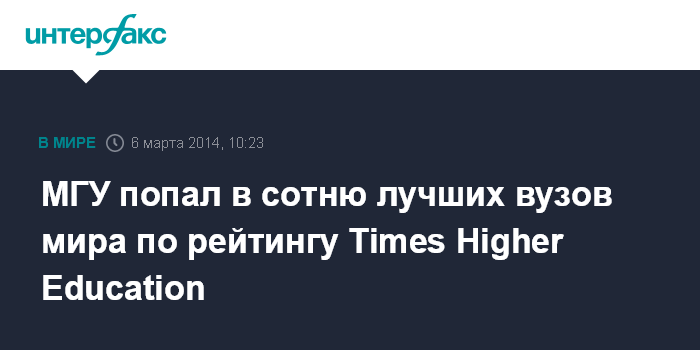 Москва. 6 марта. INTERFAX.RU - Московский государственный университет им. М.В. Ломоносова стал единственным российским вузом, вошедшим в топ-100 лучших вузов мира в рейтинге Times Higher Education (THE) World Reputation Rankings, хотя и несколько ослабил в нём свою позицию по сравнению с прошлым годом.