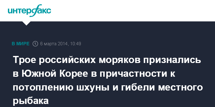 Москва. 6 марта. INTERFAX.RU - Трое членов экипажа российского транспортного рефрижератора (ТР) "Петр Ильичев" (судовладелец - камчатский рыболовецкий колхоз имени Ленина) признались в причастности к потоплению южнокорейской шхуны и гибели местного рыбака в Японском море.