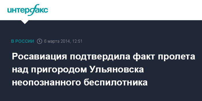 Москва. 6 марта. INTERFAX.RU - Комиссия Приволжского межрегионального территориального управления воздушного транспорта Федерального агентства воздушного транспорта (Росавиации) по результатам расследования подтвердила информацию о пролете 17 февраля над пригородом Ульяновска неопознанного беспилотного летательного аппарата.