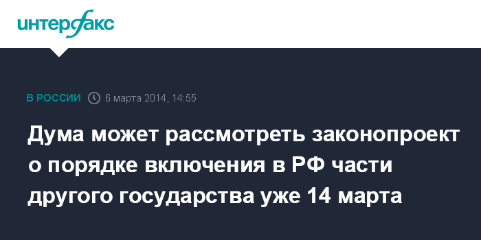 Москва. 6 марта. INTERFAX.RU - Законопроект об упрощении порядка принятия в состав России части иностранного государства Госдума рассмотрит, скорее всего, в пятницу на следующей неделе.