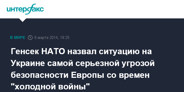 Брюссель. 6 марта. INTERFAX.RU - Генсек НАТО Андерс Фог Расмуссен охарактеризовал события на Украине как наиболее серьезную угрозу европейской безопасности со времен "холодной войны".