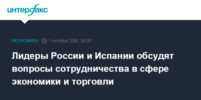 Москва. 1 октября. ИНТЕРФАКС - Состояние и перспективы торгово- экономического сотрудничества России и Испании обсудят 1 октября в Петербурге президент РФ Дмитрий Медведев и премьера Испании Хосе Луис Родригес Сапатеро.