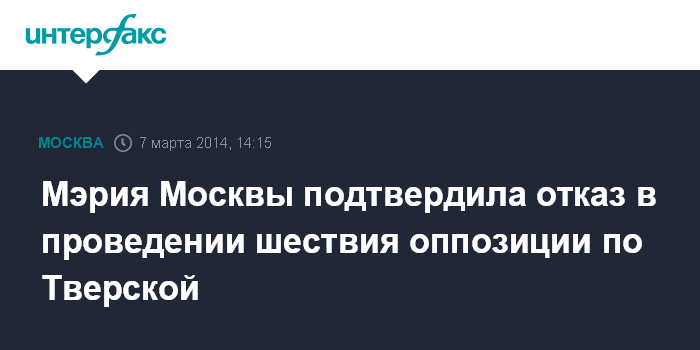 Москва. 7 марта. INTERFAX.RU - В мэрии Москвы официально подтвердили отказ согласовать шествие оппозиции 15 марта по Тверской улице.