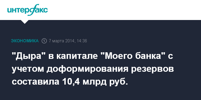 "Дыра" в капитале "Моего банка" с учетом доформирования резервов составила 10,4 млрд руб.