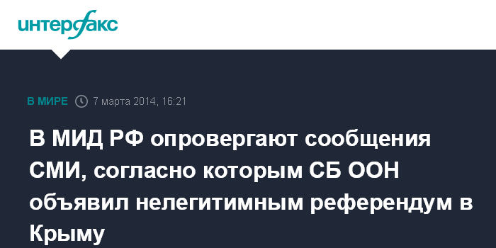Москва. 7 марта. INTERFAX.RU - Сообщения ряда СМИ о том, что СБ ООН считает референдум о статусе Крыма нелегитимным, не соответствуют действительности, заявили в МИД РФ.