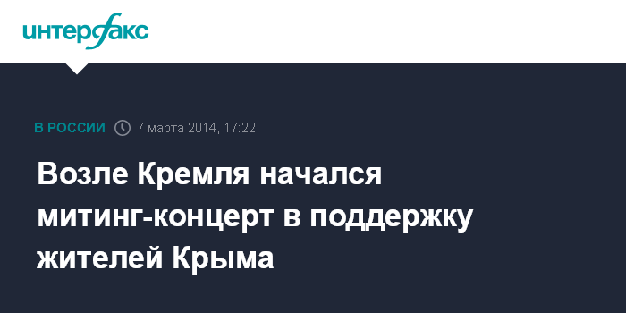 Как передает корреспондент "Интерфакса", мероприятие в поддержку жителей Крыма началось возле стен Московского Кремля в пятницу. Собравшиеся на митинг-концерт люди держат флаги России, партии "Единая Россия", ряда организаций, в частности, "Офицеры России", "Георгиевцы", а также учебных заведений, в том числе, Медицинской академии имени Сеченова, Московского финансово-юридического университета (МФЮА). Люди держат таблички "Верим Путину", "Крым - русская земля", "Своих не сдаем" и другие.