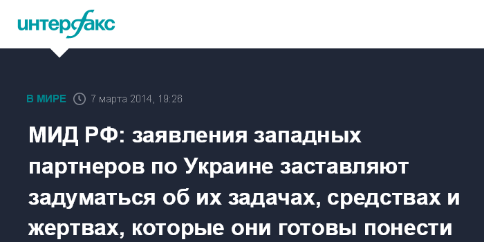 Москва. 7 марта. INTERFAX.RU - МИД РФ считает, что позиция европейских и евроатлантических организаций по ситуации на Украине заставляет задуматься об истинных целях, которые они преследуют, средствах для их достижения и о жертвах, которые они готовы при этом понести.