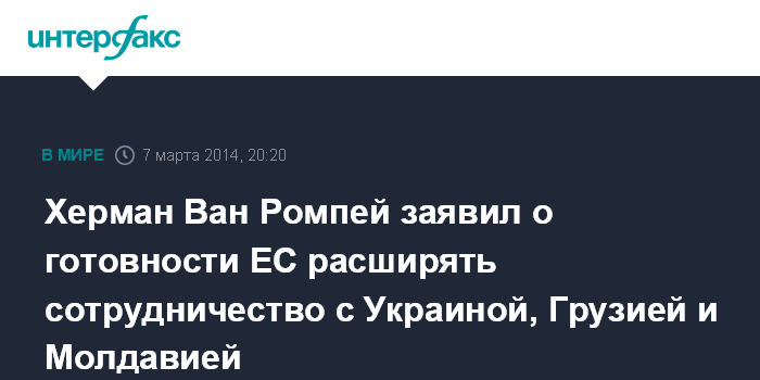Москва. 7 марта. INTERFAX.RU - Председатель Европейского совета Херман Ван Ромпей заявил о готовности ЕС расширять сотрудничество с Украиной, Грузией и Молдавией.