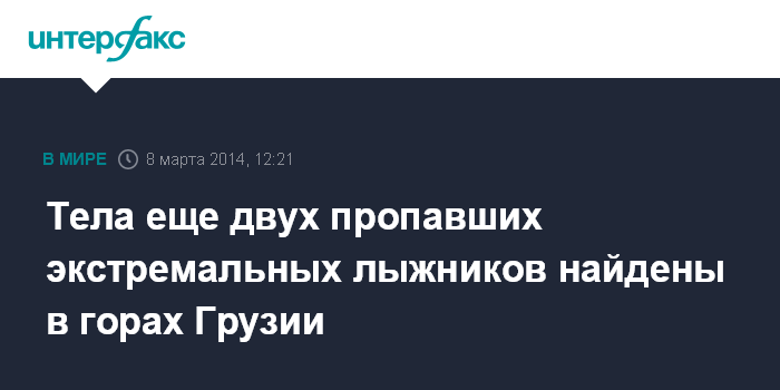 Москва. 8 марта. INTERFAX.RU - В горном регионе Грузии - Сванети - в субботу найдены тела еще двух иностранных туристов, погибших в результате схода лавины, сообщает в субботу департамент по чрезвычайным ситуациям МВД Грузии. В ведомстве добавили, что работы возобновились рано утром и тела погибших были найдены в течение двух часов.