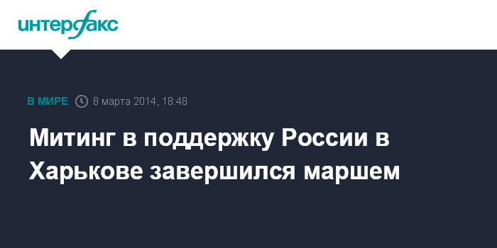 Москва. 8 марта. INTERFAX.RU - Часть участников пророссийского митинга на площади Свободы в Харькове решила устроить в завершение акции антифашистский марш. Как передает корреспондент агентства "Интерфакс-Украина", в колонне под российскими флагами по направлению к площади Конституции отправились около 1,5 тыс. человек.