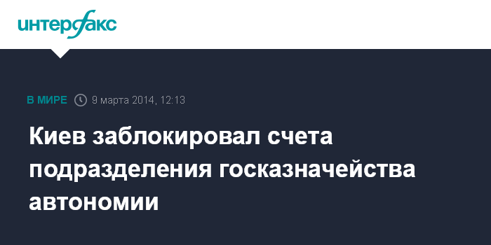 Москва. 9 марта. INTERFAX.RU - Вице-премьер автономной республики Крым Рустам Темиргалиев заявил, что власти Киева отключили электронные системы крымского подразделения госказначейства и заблокировали счета крымской автономии.
